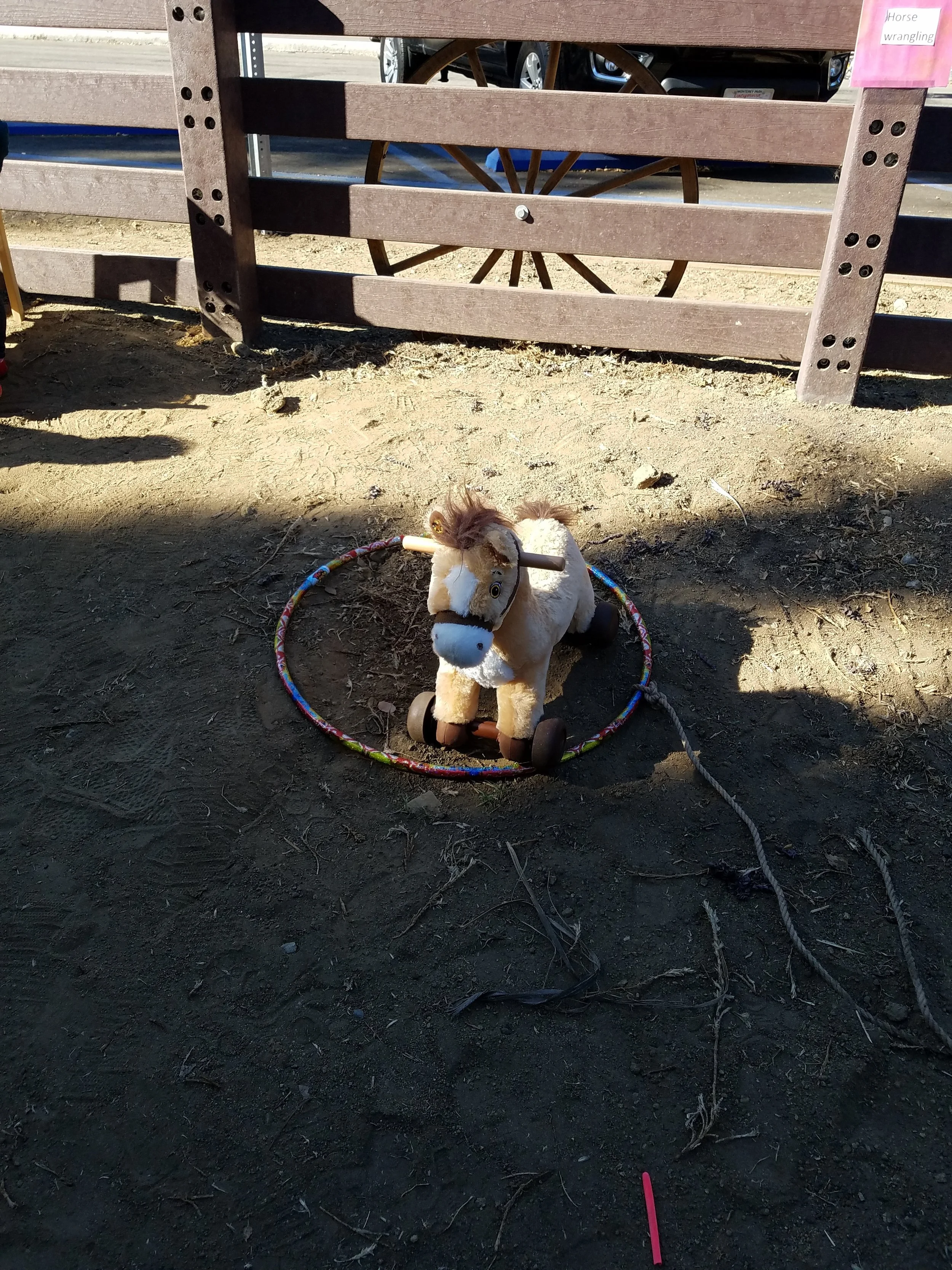Wrangle a horse. Rope tied around a oola hoop and our small play horse.